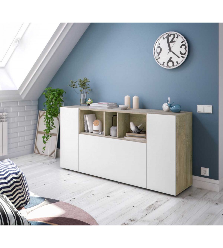 Aparador de 3 puertas. El mueble tiene en parte central una zona de huecos en acabado madera.